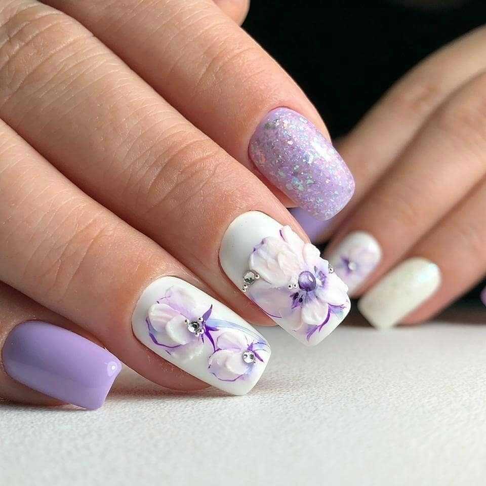 Уместен и маникюр с фиолетовыми цветами на светлом фоне, дополненный мелкими стразами.