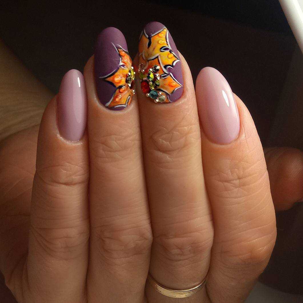 На фото маникюр украшен двумя оттенками стразов под цветовую палитру рисунка, что дополнительно оттеняет сочетание цветов. Подробнее о применении цветных акриловых пудр для создания интересных дизайнов ногтей.