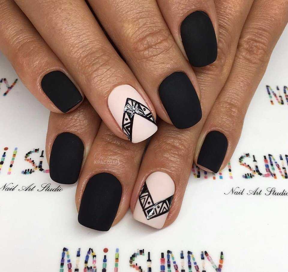 В этом году актуален сдержанный, спокойный матовый маникюр: смело выбирайте светло-розовые, серые, коричневые цвета. Главное условие – это однотонность и матовое покрытие сверху (никаких дополнительных элементов дизайна!). Если же такой вариант вам кажется слишком скучным, то в моду также вошел матовый геометрический маникюр. Смело сочетайте на своих ногтях асимметрию и геометрические фигуры различных цветов – главное, помните, как удачно эти самые цвета подобрать.