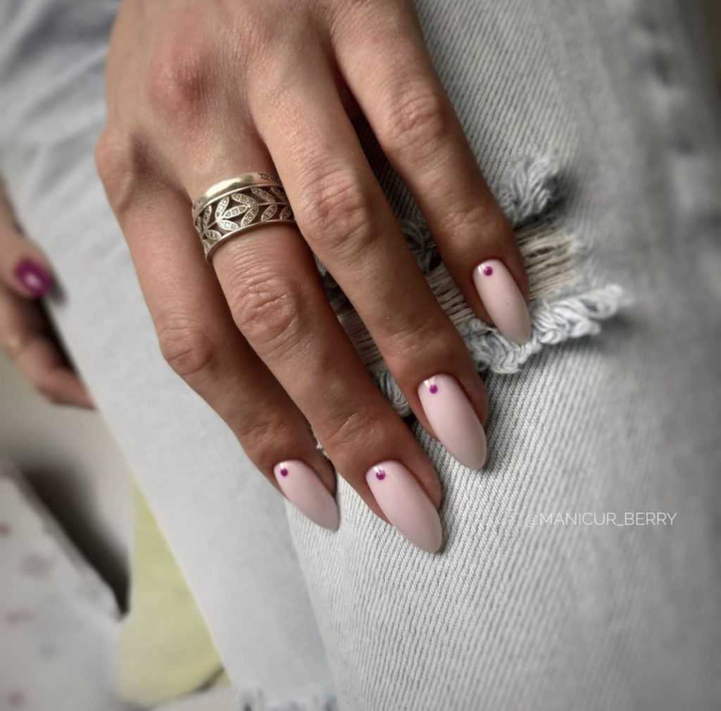 Этот дизайн был самым востребованным в салонах по всему миру в течение нескольких месяцев. Их называют «точечными ногтями». Это гладкая, одноцветная основа, обычно пастельных тонов, с микроточками, расположенными близко к эпидермису.