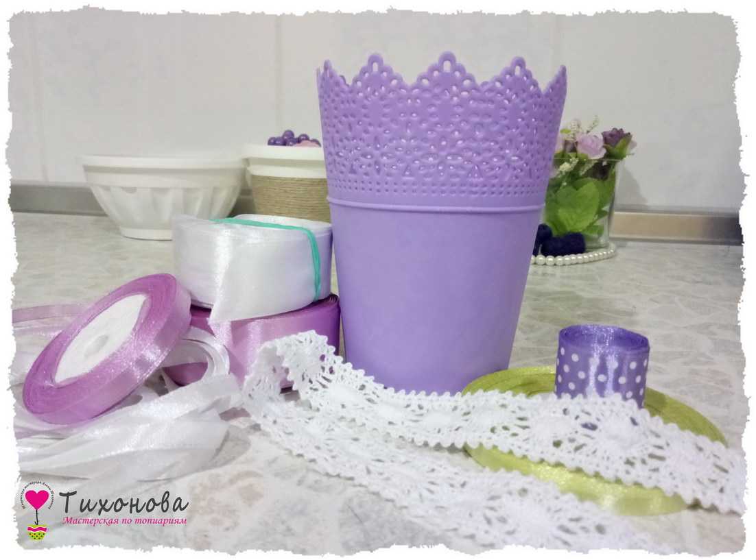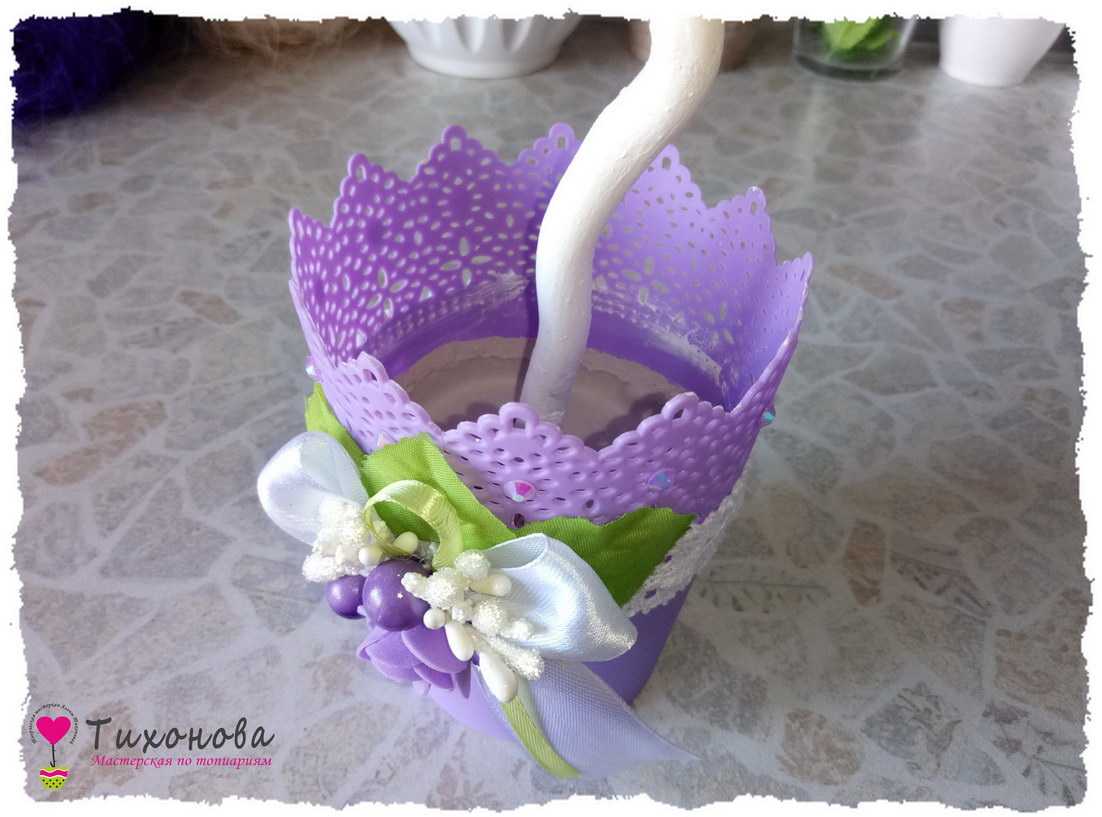 Горшок топиария декорируем белым кружевом и атласным бантом. На бант клеим фоамирановую розу, тычинки и сиреневые гладкие ягоды.