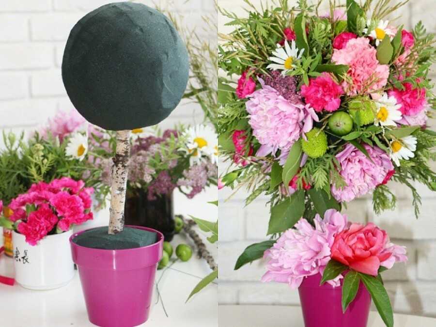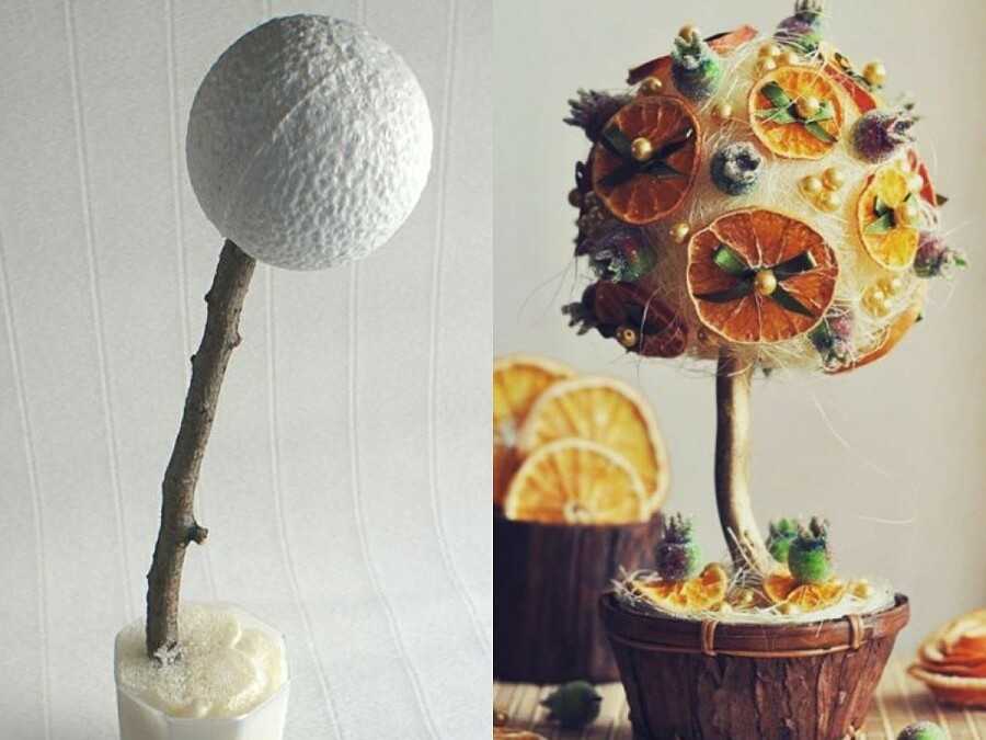 В качестве заготовки кроны топиария можно использовать детский пластиковый мяч, также можно сделать шар из пенопласта или макрофлекса