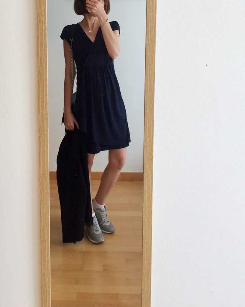 Платье лаконичного кроя также можно сочетать со сникерсами