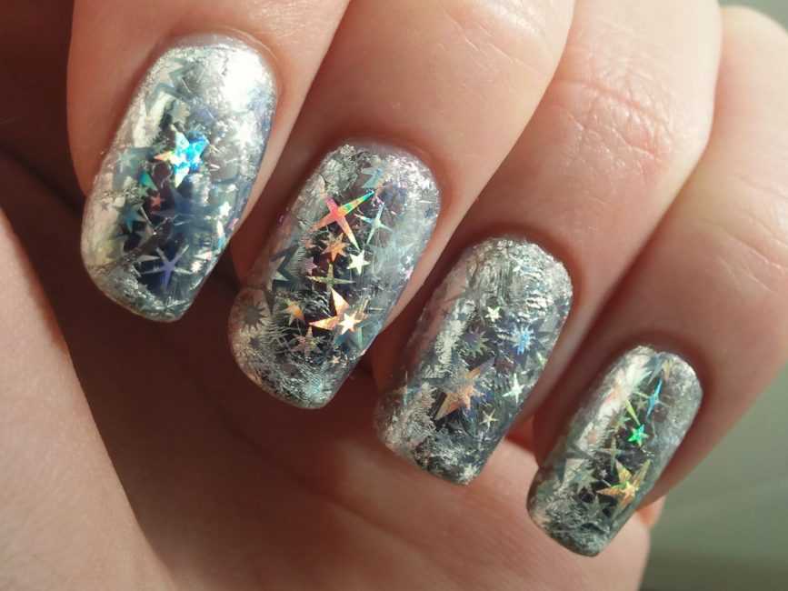 Поскольку эффект битого стекла в маникюре полюбился многим в прошлом сезоне, закономерен факт того, что он перекочевал в нынешний. Подходит абсолютно всем – возраст и стиль здесь не играет роли вообще. Работать с материалом очень легко. Для его создания достаточно купить специальную фольгу или целлофан с голографической фактурой. Порезать его кусочками и уложить на палец по своему усмотрению. Сверху покрыть слоем прозрачного лака. Световой поток, попадая на ноготь будет преломляться, создавая тем самым самые причудливые варианты игры света, напоминающие отблески драгоценных камней.
