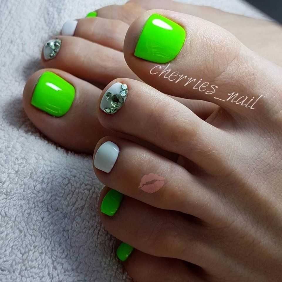 Зеленый не первый год занимает топовые места среди оттенков, которые популярны в маникюре. Теперь пришло время добраться и до педикюра. Оказывается, выбрать можно из многочисленного количества зеленого цвета: начинаем от ярко-зеленого и заканчиваем изумрудным и глубоким тоном. Вписать подобный оттенок в привычный и повседневный образ просто, особенно, если вы отдаете предпочтение классическому цвету. Можно также сочетать с многочисленными иными тонами, разбавляя их, делая рисунки, используя зеленый тон в виде глиттера и прочее.