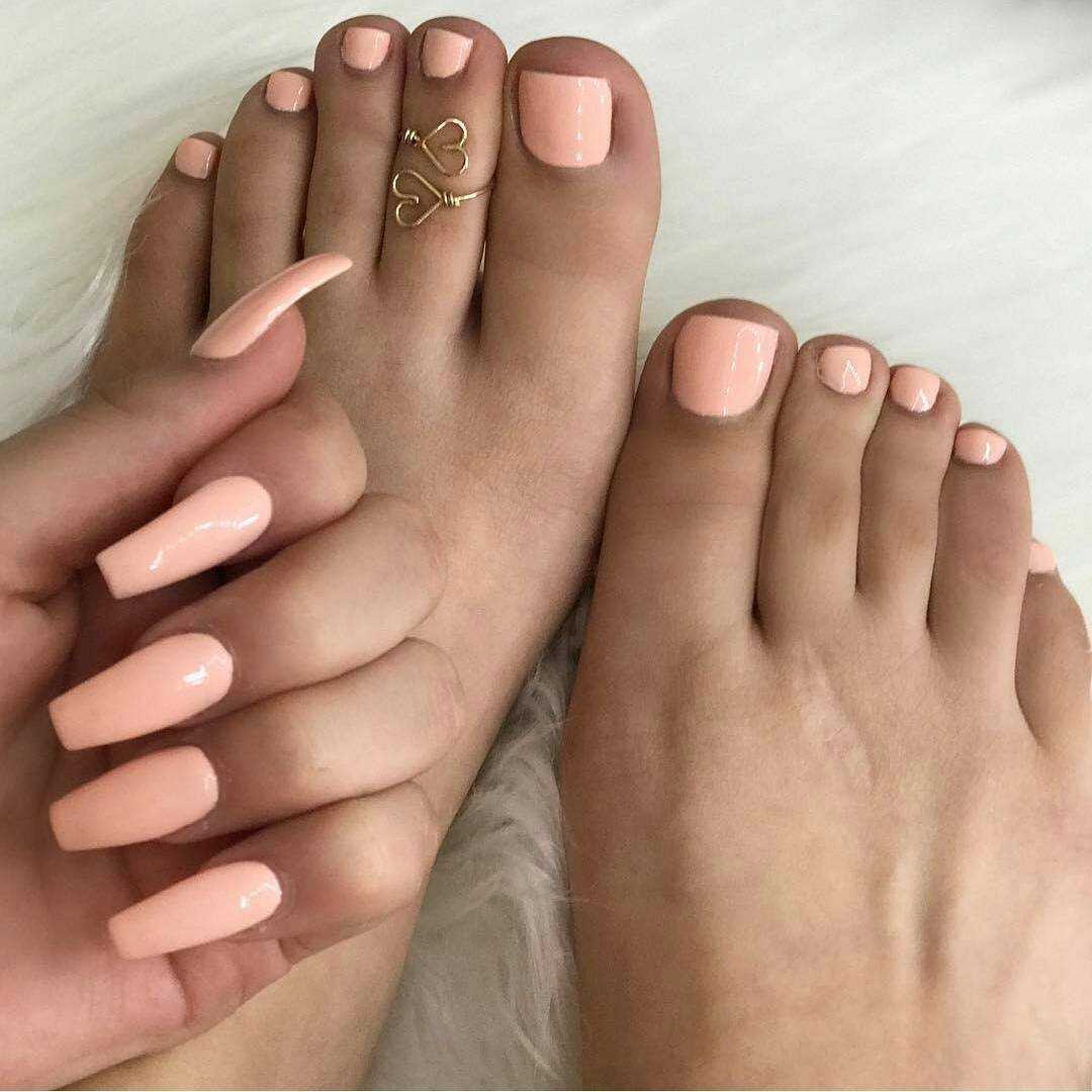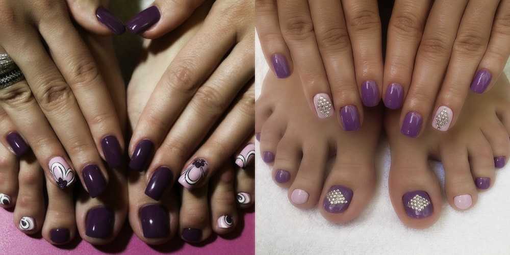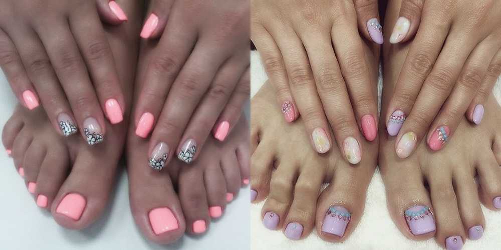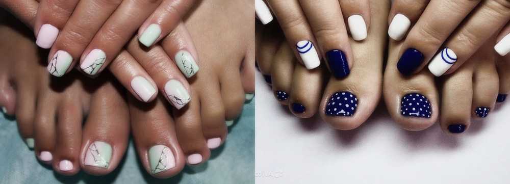 На фото представлены варианты решений того, как могут сочетаться ноготки на ваших руках и ногах, будучи выполненными в едином стиле.