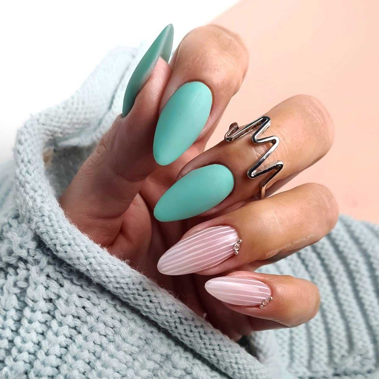 Без мятного маникюра весенне-летний сезон просто нельзя вообразить. Но его можно сделать и в другой время года — смотреться будет не менее круто. В теплую пору года можно добавить стильные рисунки в виде силуэтов лиц или абстрактные мотивы. Зимой актуален «вязаный» маникюр и сезонные тематические иллюстрации в виде медведей, варежек или снежинок.