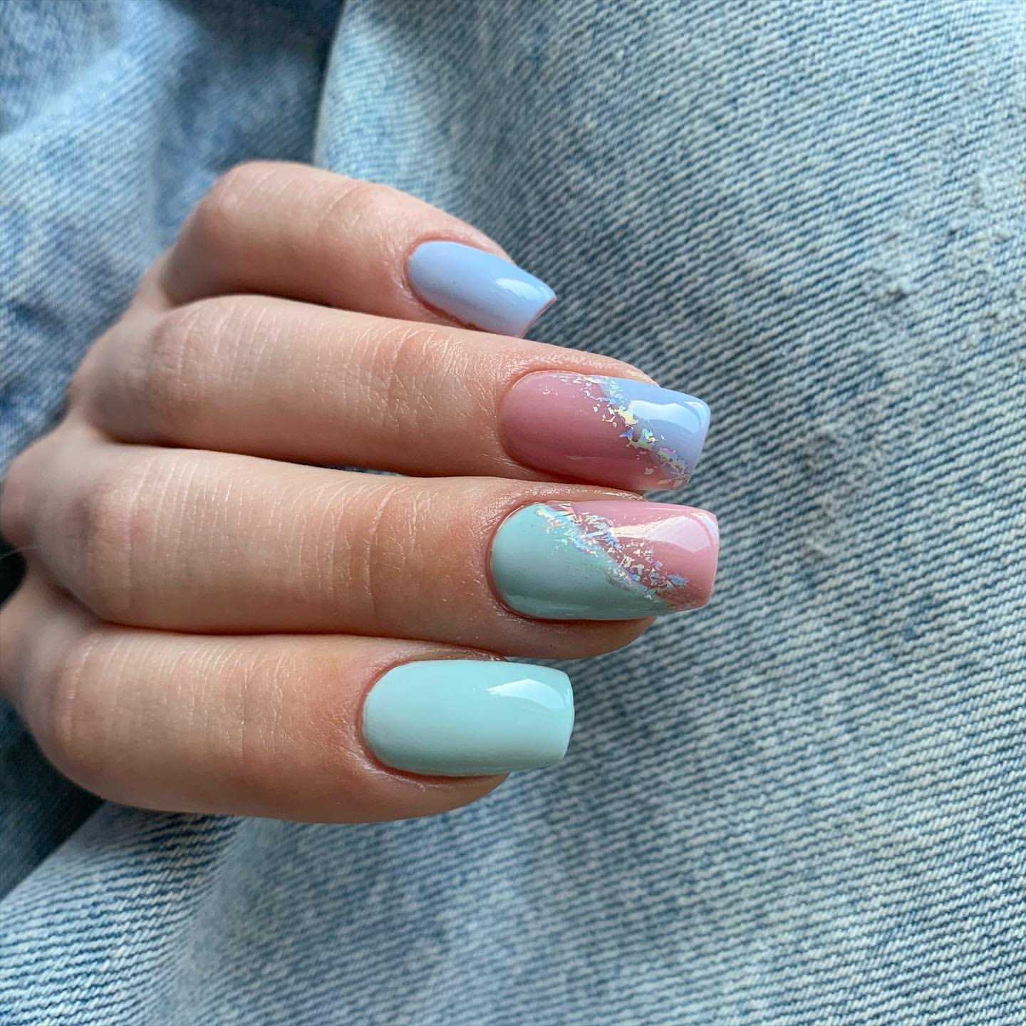 В качестве фона для маникюра красиво смотрится градиент в пастельных тонах или эффект затирания, особенно если такой маникюр оформлен блесками.