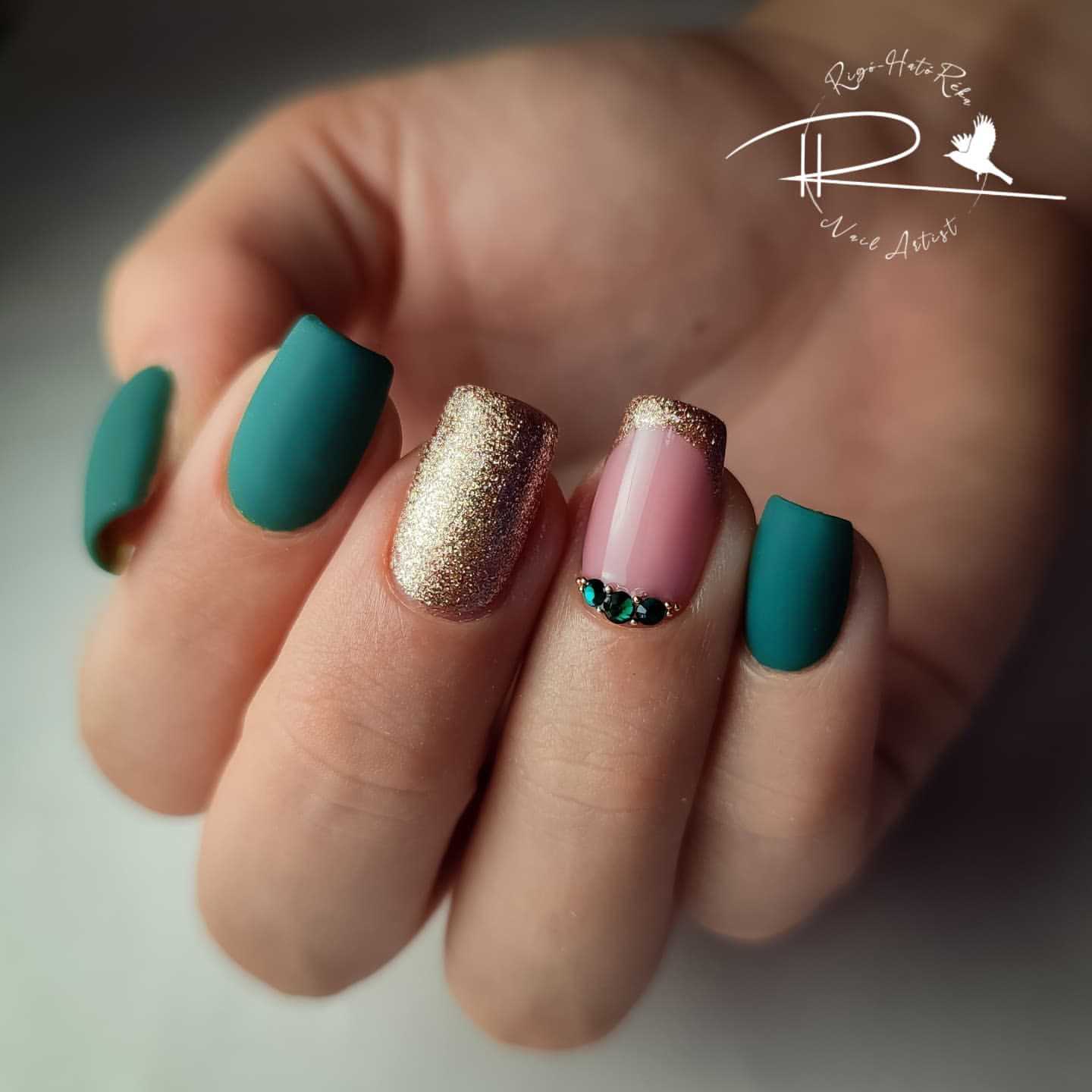 Опытные мастера советуют декорировать изумрудный нейл – арт серебряной и золотистой фольгой, глиттером, прозрачными кристаллами и т.д. И даже, если у вас под рукой нет декора, вы всегда можете создавать эффектный и яркий маникюр, в котором гармонично скомбинированы матовые и глянцевые поверхности.