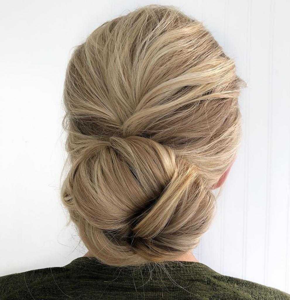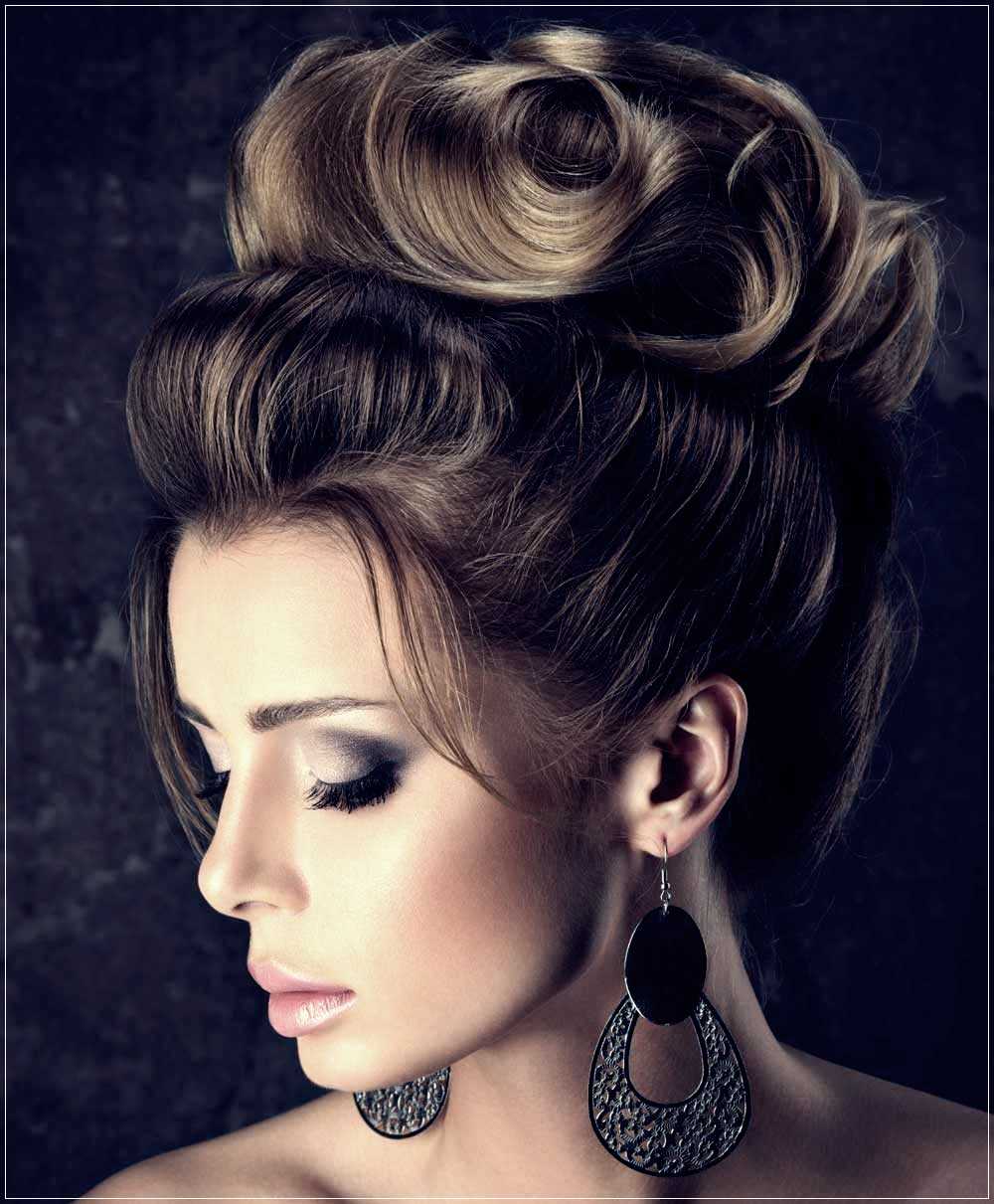 Эту укладку особенно ценят стилисты — на ее основе делают шикарные свадебные и вечерние прически. Технология ее выполнения очень похожа на технологию создания хвоста с начесом. Сначала волосы так же разделяются на три части: у лба, на темени и макушке и на затылке. Из средней части формируется начес, который сверху нужно прикрыть предварительно разглаженными прядями со лба. Затем все волосы собираются в пучок. Это можно сделать различными способами, в зависимости от выбранного типа пучка.