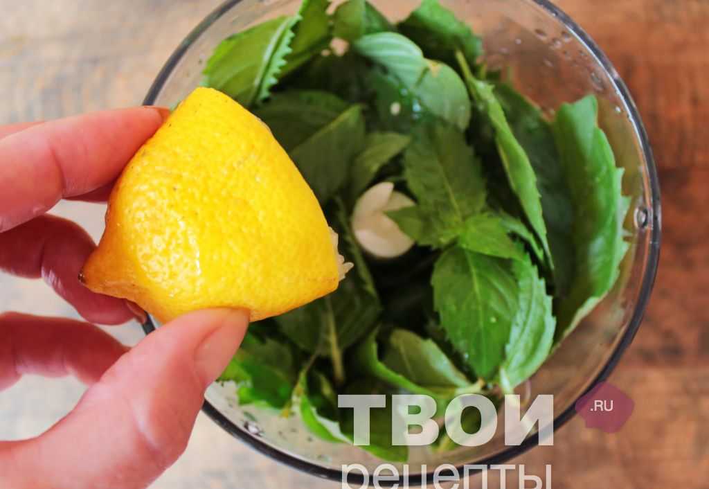 Выдавить к мяте лимонный сок. Следите, чтобы в блендер не попали косточки. Листья смолоть в крошку.