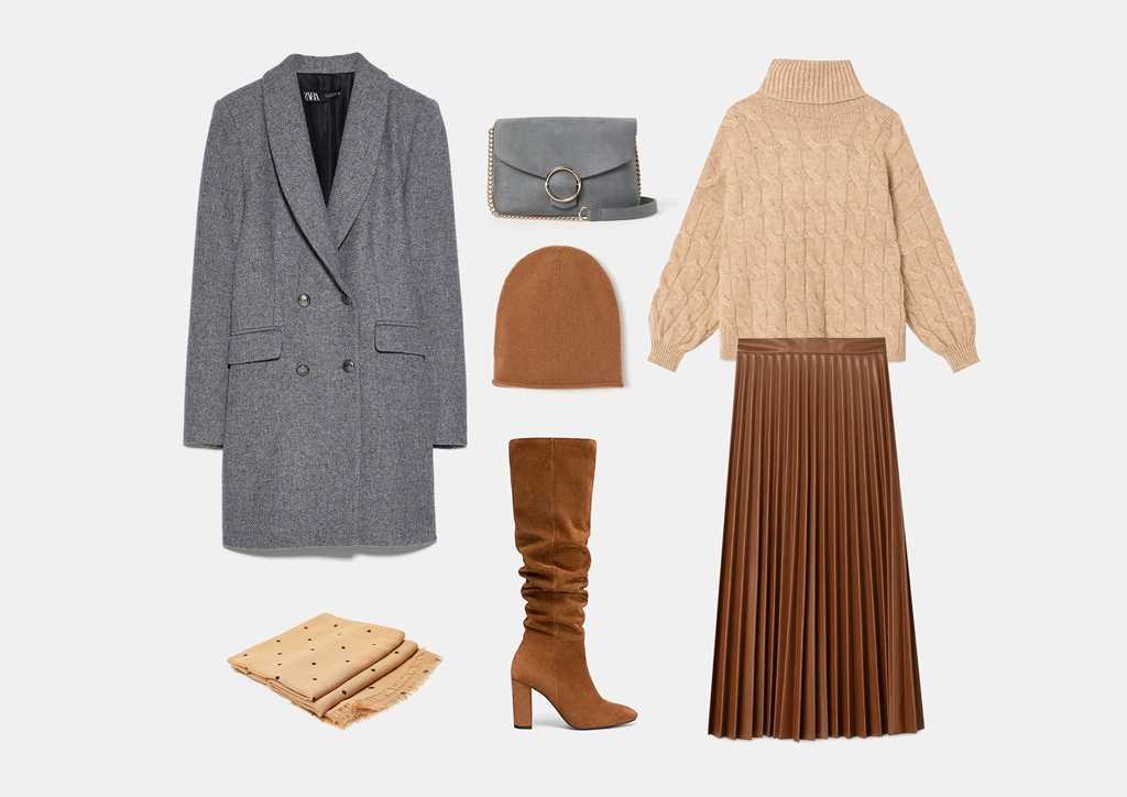 Итак, за основу возьмём трендовую кожаную юбку-плиссе и объемный свитер с косами. Добавим высокие замшевые сапоги на каблуке с широким голенищем. Если решите составить подобный комплект, смотрите, чтобы сапоги заходили под юбку и чтобы у юбки была правильная миди длина. Дополняют образ платок в горошек, шапка бини и серая замшевая сумка кросс-боди. Цвет сумки перекликается с цветом пальто, так образ смотрится максимально гармонично и целостно.