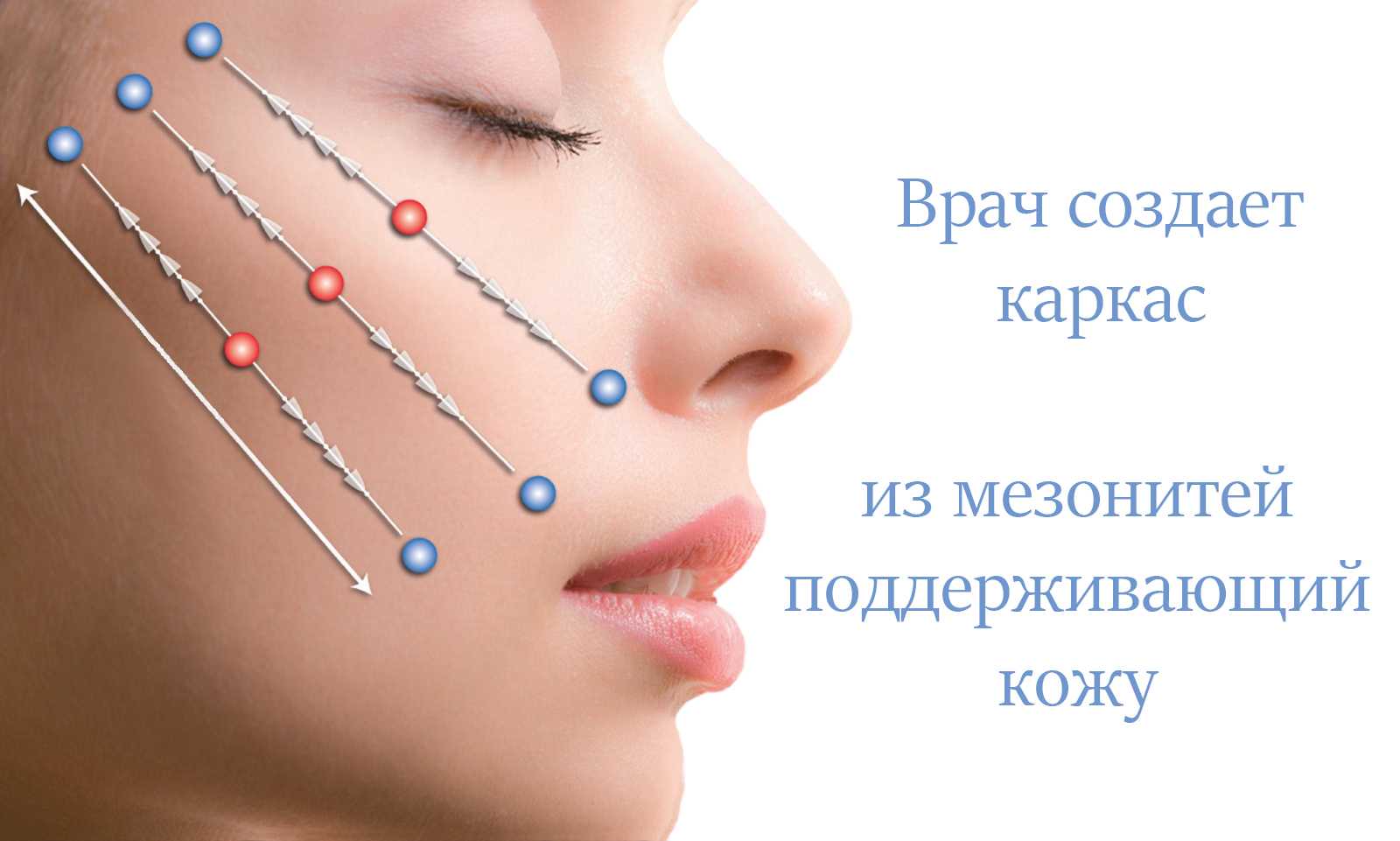 По показаниям можно делать нитевую подтяжку. При этом используются прочные нити с насечками, которые прочно закрепляются в тканях и позволяют их приподнимать, подтягивать.
