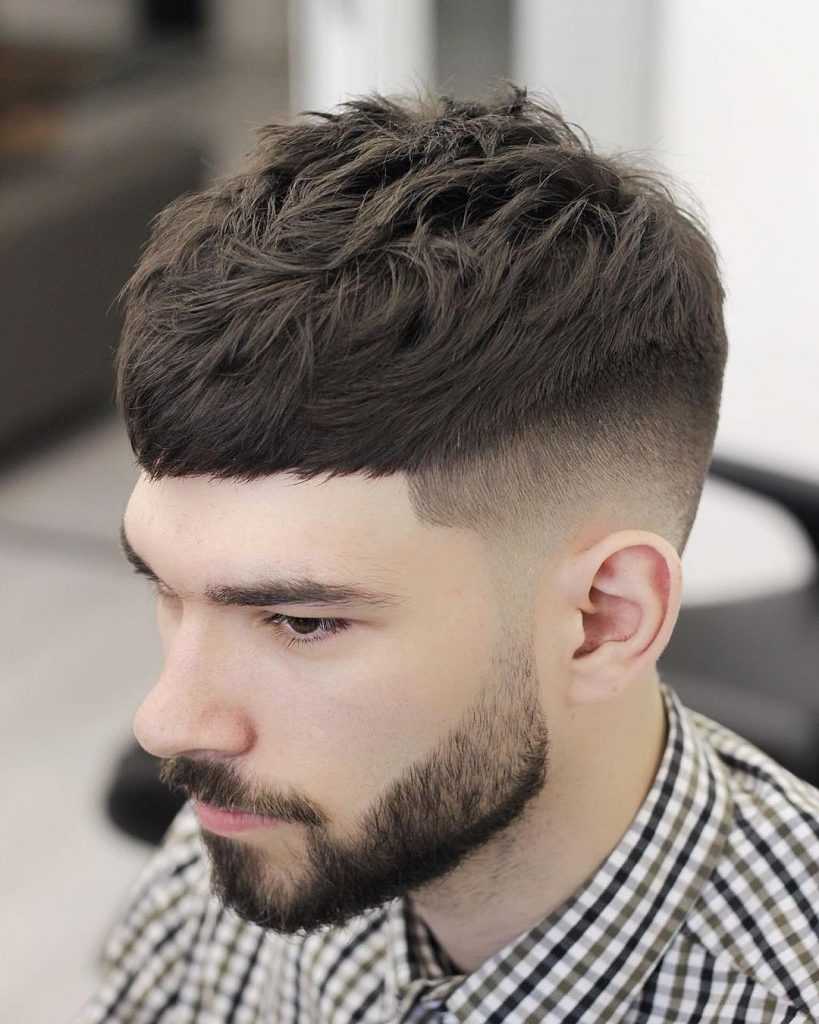 Укороченный вариант мужской стрижки предполагает продольный ободок, который выбирают для челки, как правило, до бровей. Затылок глубоко выбрит. Часто короткая прическа горшок встречается рядом с укороченными височными зонами. Подходит высоким, стройным, спортивным и элегантным юношам.