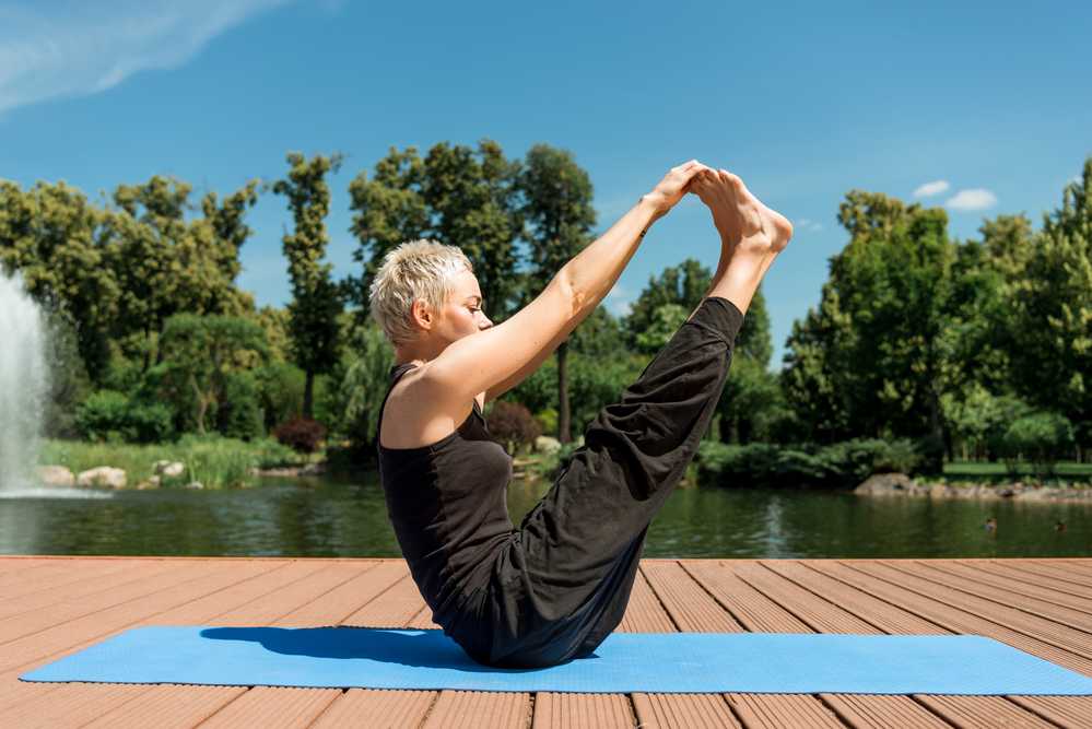 Встаньте с коврика, расправьте спину, поставьте ноги вместе. Найдите точку опоры и возьмитесь за нее левой рукой. Правой рукой захватите правую ногу и подтяните вверх. Оставайтесь в этом положении 20-30 секунд. Затем это же упражнение на растяжку сделайте на другую ногу.