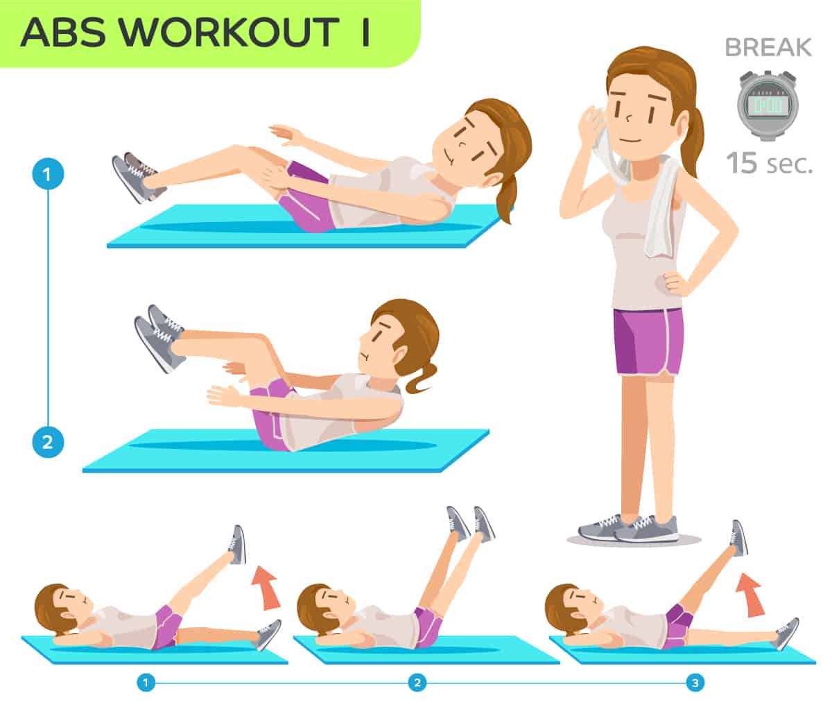 Тренировки включают 2–3 подхода на каждую из вариаций с трёхминутным перерывом для отдыха. Прокачивать пресс желательно трижды в неделю, постепенно увеличивая нагрузки и частоту занятий. Кроме того, можно выполнять упражнения с использованием утяжелителей для ног.