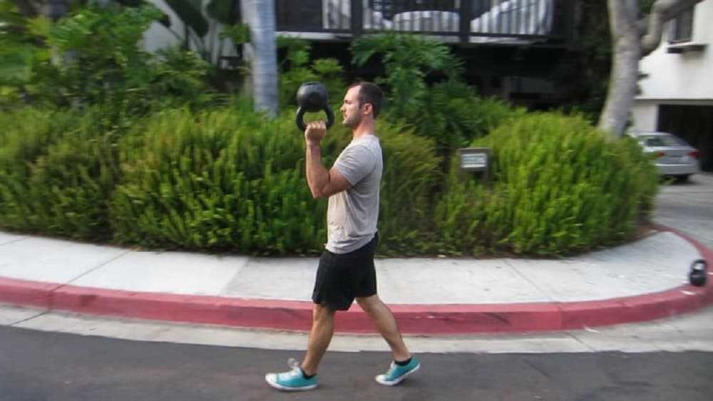 Затем нужно встать между снарядами и взять их руками как можно плотнее. Как только вы взялись за ручки, необходимо начать движение вперед. Заранее можно определить расстояние, которое вы планируете пройти. Однако можно просто двигаться до тех пор, пока вы не почувствуете жжение в мышцах. Далее поставьте отягощение на пол и отдыхайте на протяжении 2-3 минут.