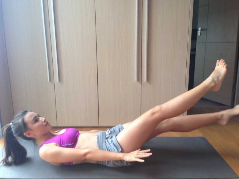 Ляг на спину и согни колени под углом 90 градусов, слегка развернув их наружу, как лягушка. Пятки держи прижатыми друг к другу. Напряги живот и подтяни ноги к груди. При этом, когда ты подтягиваешь ноги, голова и плечи должны отрываться от пола. Ненадолго зависни в таком положении, затем выпрями ноги под углом 45 градусов к полу и вернись в исходное положение. Достаточно десяти повторений.