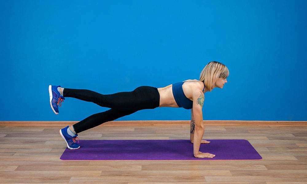 Попеременный подъем ног существенно увеличивает нагрузку на нижний пресс. Сперва задержитесь 30-40 сек в планке, затем сделайте 5-10 подъемов каждой ногой. Держите мышцы живота в напряжении.