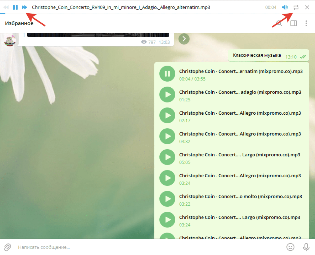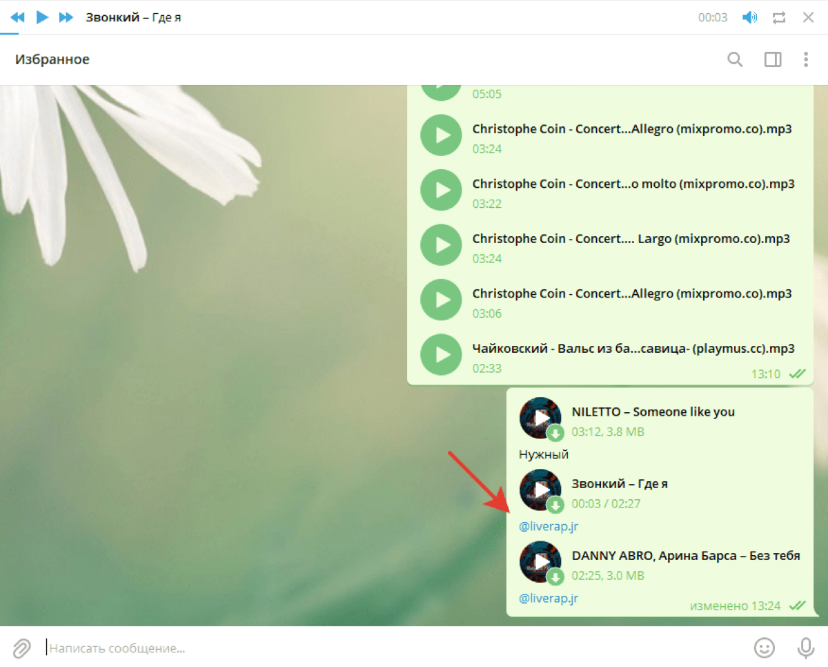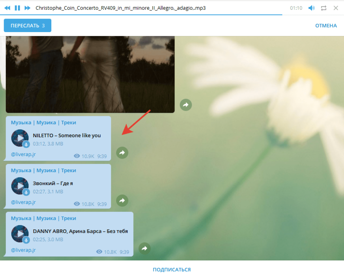 Вы также можете составлять плейлисты из нескаченных треков. Для этого зайдите в бот или канал с нужной вам музыкой. Выделите треки для плейлиста.