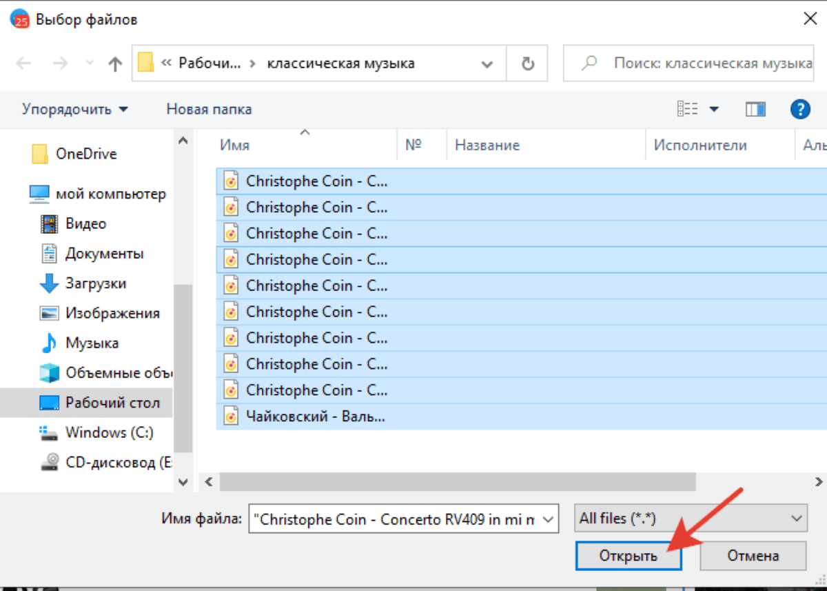 Затем выберите нужные треки и нажмите на кнопку «Открыть».