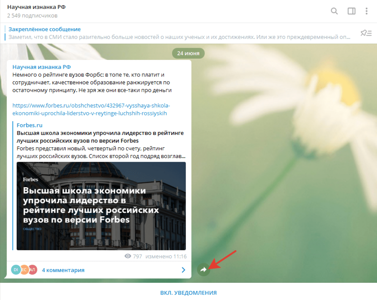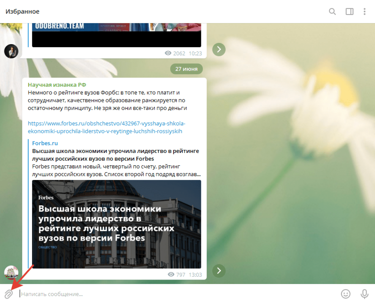 Прежде всего заходим в «Избранное». Если вы никогда не сохраняли посты в «Избранное», сделайте это. Выберите любой пост, нажмите на кнопку «Переслать».