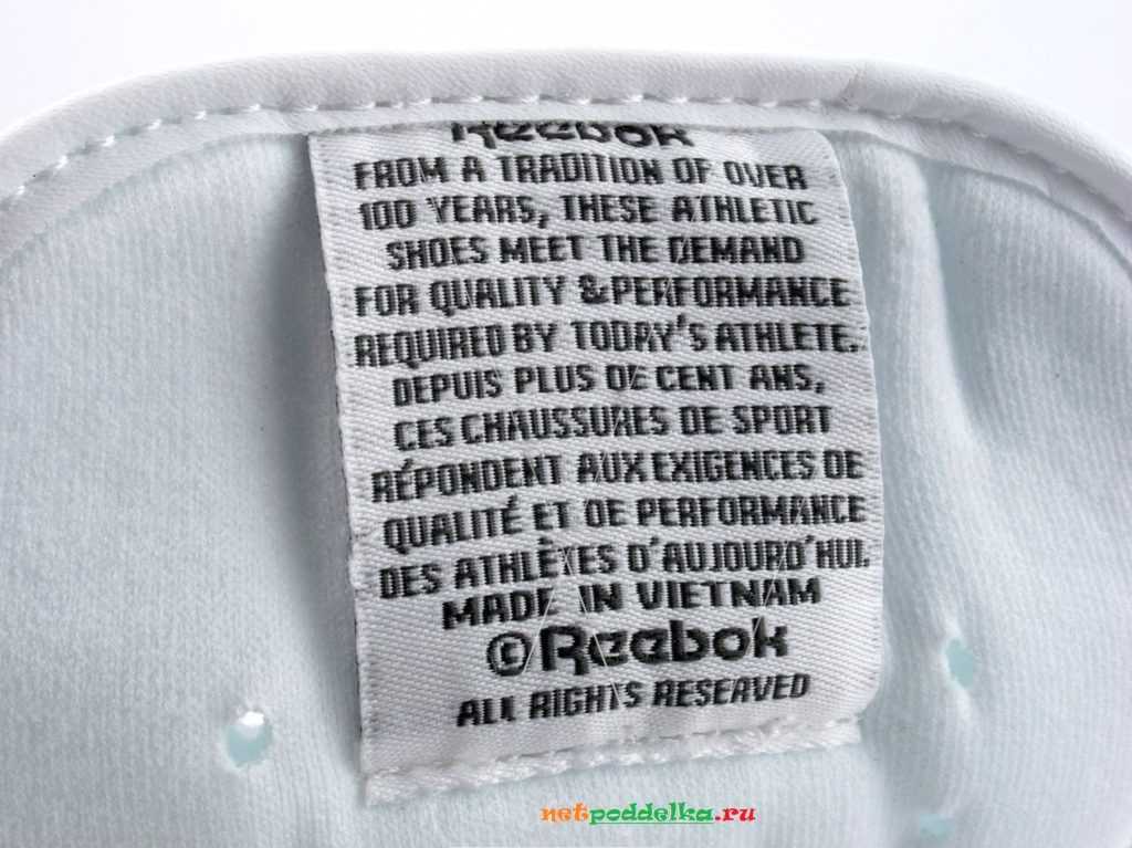 На обратной стороне язычка присутствует бирка с текстом. В нем повествуется об истории компании Reebok. Бирка должна быть пришита плотно и аккуратно. Недопустим перекос букв или их выпадения со строки. В части текста обязательно присутствуют специальные знаки французского языка.