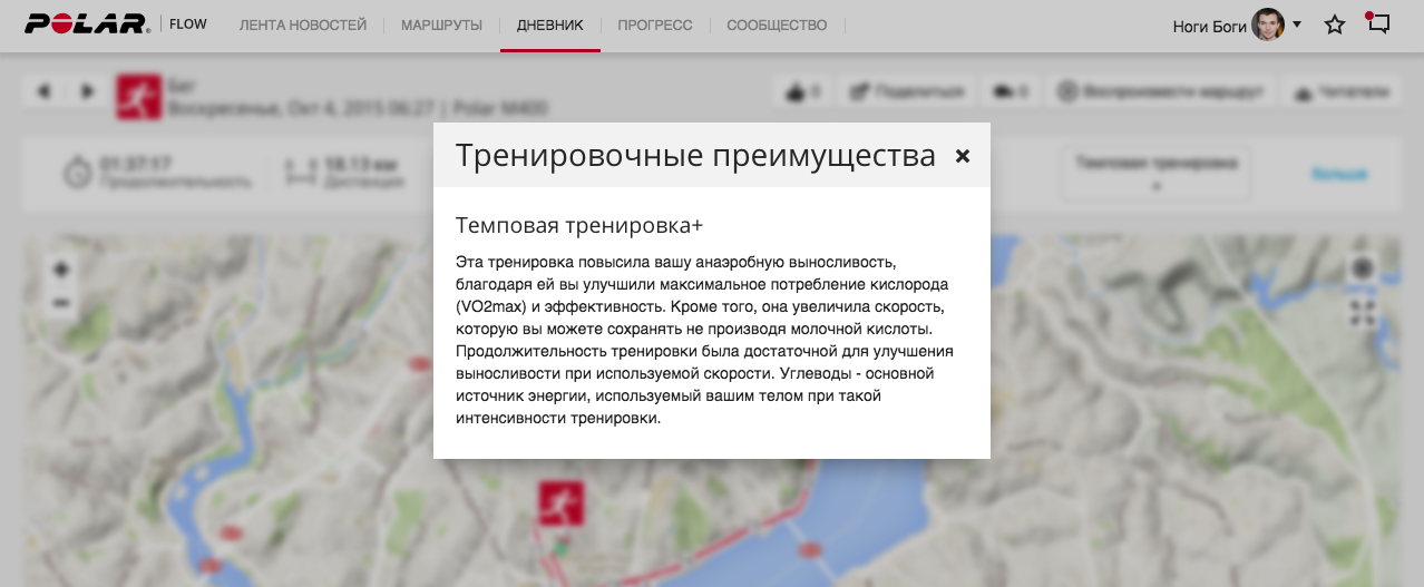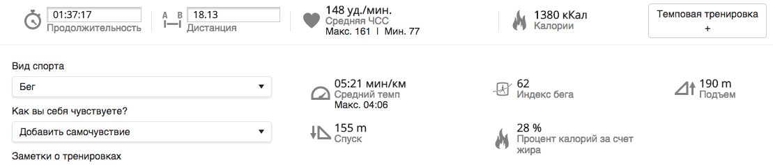 Еще в помощь бегуну приходят короткие информационные сводки после окончания тренировки. В зависимости от длительности и интенсивности тренировки, система рассказывает какие функции организма вы тренировали. Это может быть скоростная выносливость, равномерная тренировка базовых функций организма и т.п.
