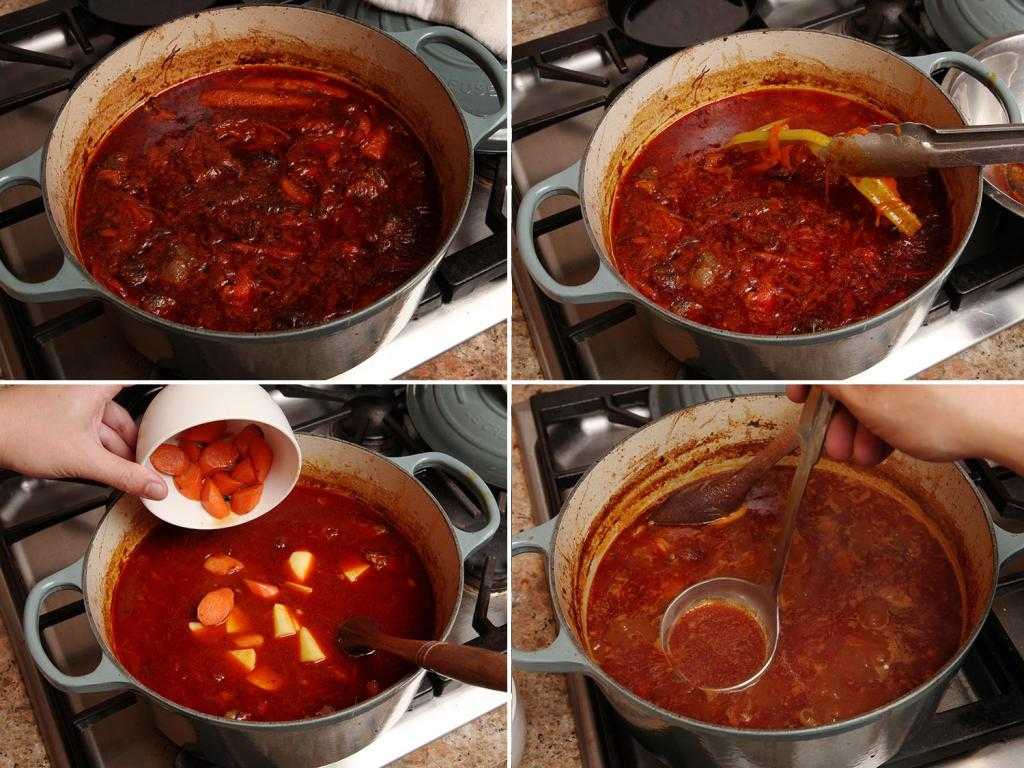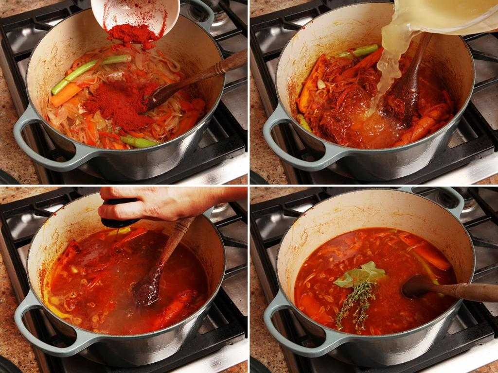 Сначала в течение нескольких минут обжаривается лук, морковь, чеснок на свином жире. Добавляется нарезанное кубиками мясо. Через 10-15 минут выкладывается паприка и вливается 250 мл воды. Смесь тушится около получаса, воду нужно подливать. Добавляется нарезанный кубиками картофель, очищенные от кожуры измельченные помидоры. За несколько минут до готовности картофеля в гуляш добавляются клецки или лапша, чеснок, пряности. Суп-гуляш посыпается зеленью.
