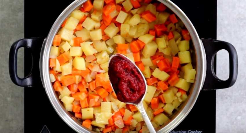 Шаг 5. Обжариваем лук с морковкой на растительном масле. Дополняем овощи томатной пастой, солью и специями по вкусу. Перемешиваем и томим на маленьком огне около 10-15 минут.