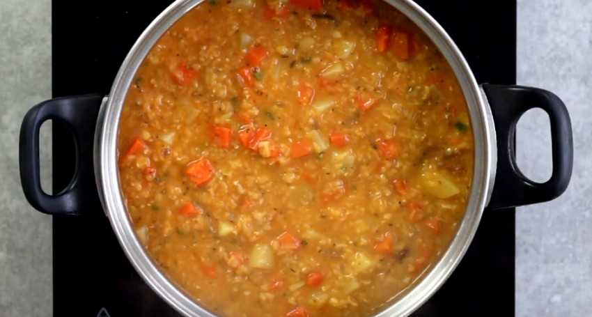 - К овощам добавляется чечевица, и ингредиенты заливаются половиной кокосового молока (если жидкости оказалось мало, она разбавляется обычной водой). Вместе компоненты варятся до мягкости бобовых на очень медленном огне.