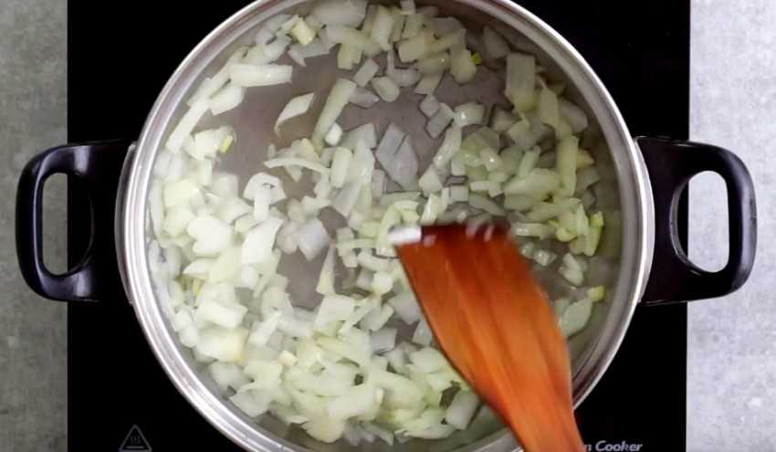 1. Влейте на дно кастрюли растительное масло, разогрейте и выложите мелко нашинкованный лук. Обжарьте, периодически помешивая, примерно 5-6 минут.