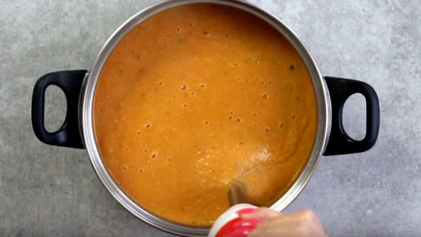 6. Измельчите суп до состояния пюре, воспользовавшись погружным блендером.
