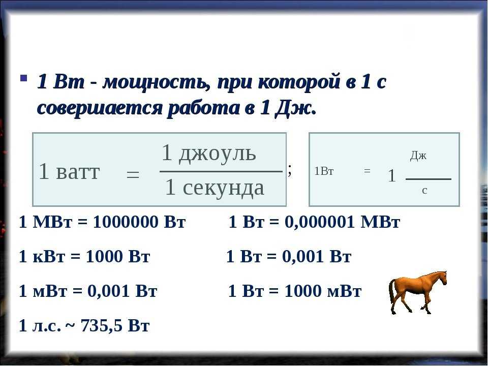 Ватт относится к производной единице измерения мощности, поэтому на практике иногда необходимо определять значение параметра по отношению к основным единицам международной системы СИ. В технических расчетах используются следующие соответствия основным значениям: