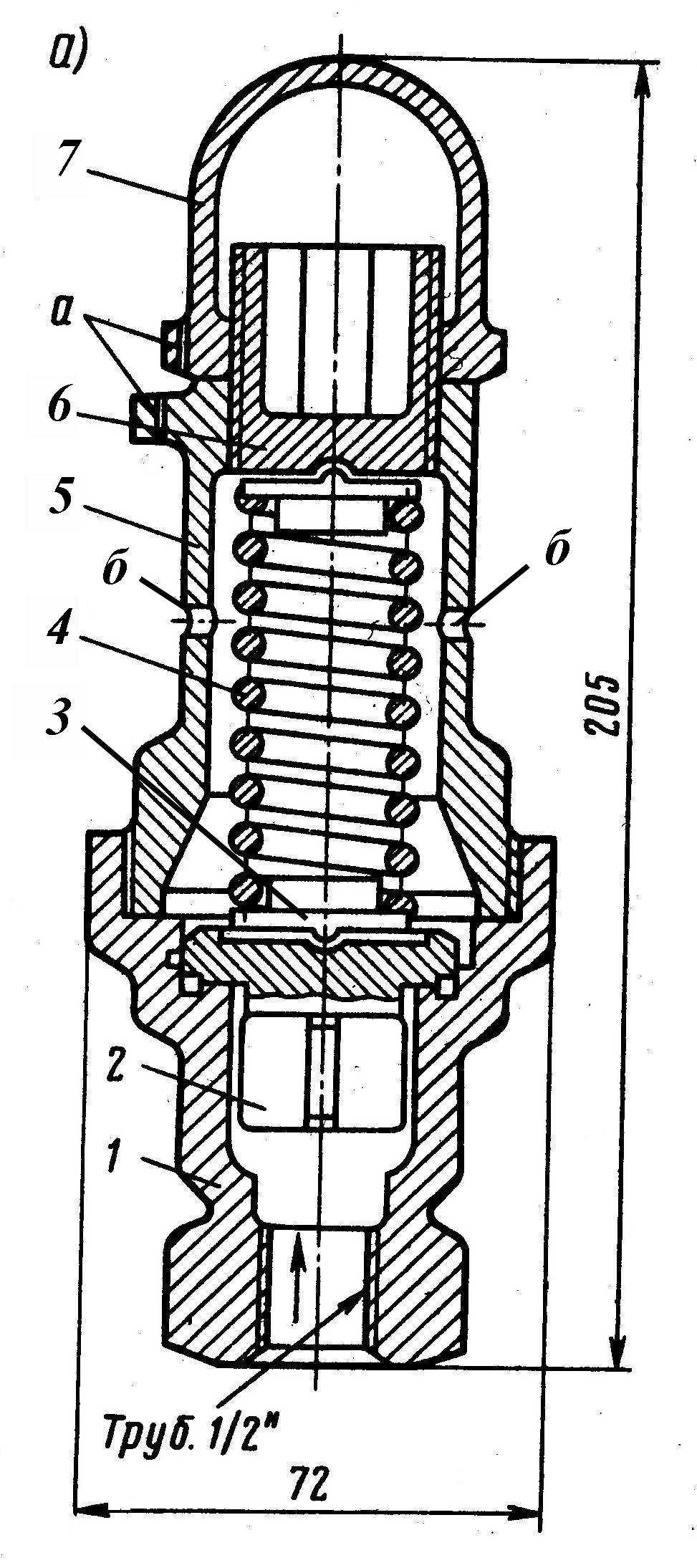 Штуцер 1; тарельчатый клапан с направляющими ребрами (направляющими перьями) 2; центрирующие шайбы 3; пружина 4; стакан с пломбировочными (а) и атмосферными (б) отверстиями 5; регулировочная гайка 6; колпачок с пломбировочным отверстием 7.