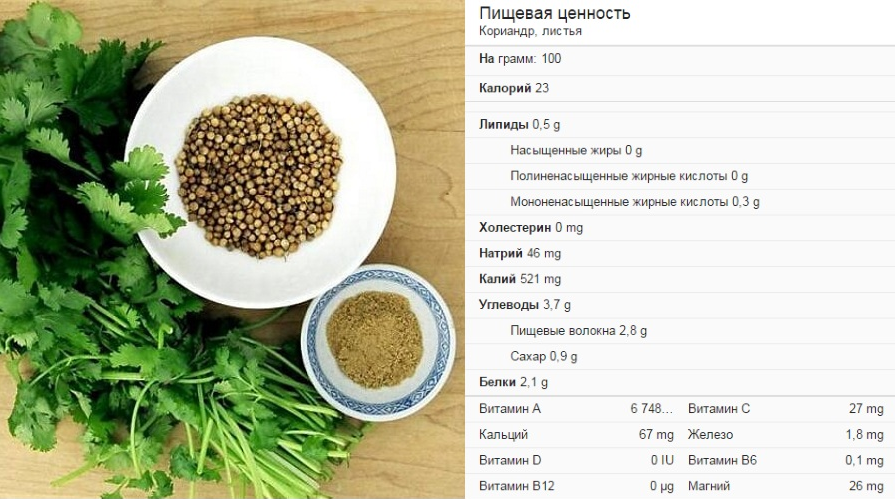Что касается калорийности, то зелень кориандра содержит 23 ккал в 100 г продукта.