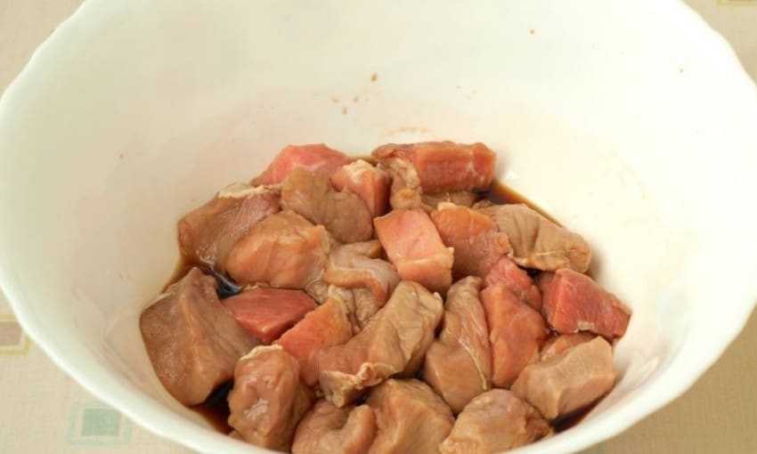 1. Нарежьте свинину небольшими кусочками и замаринуйте на 15-20 мин в соевом соусе. Если нет соевого соуса, можете сделать маринад из уксуса и лука.