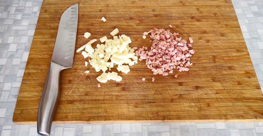 Нарубить ветчину очень мелкими кубиками. Сыр натереть на крупной терке или нарезать очень мелко.