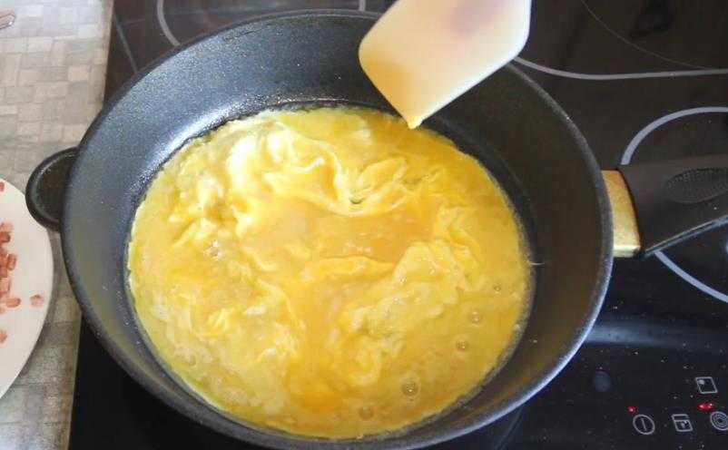 5. Затем вылить яичную массу, перемешать и жарить на небольшом огне, пока масса не загустеет.