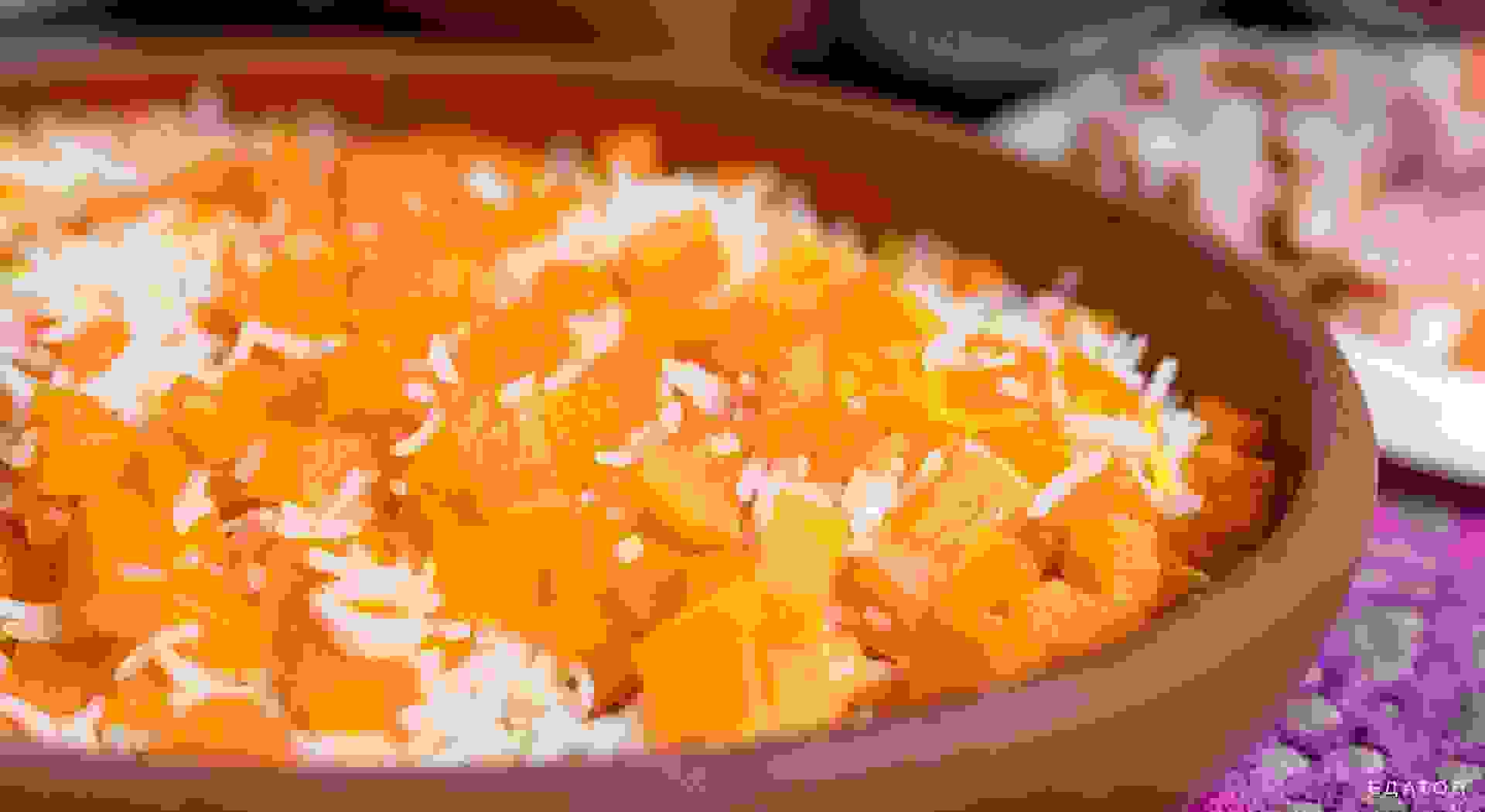 - В чаше мультиварки или утятнице растопить немного сливочного масла, выложить ломтики тыквы, сверху часть риса, следующим слоем — фрукты в сахаре. Засыпать оставшимся рисом и залить подсоленной водой так, чтобы был прикрыт верхний слой крупы. Закрыть крышку и тушить на слабом огне в течение часа.