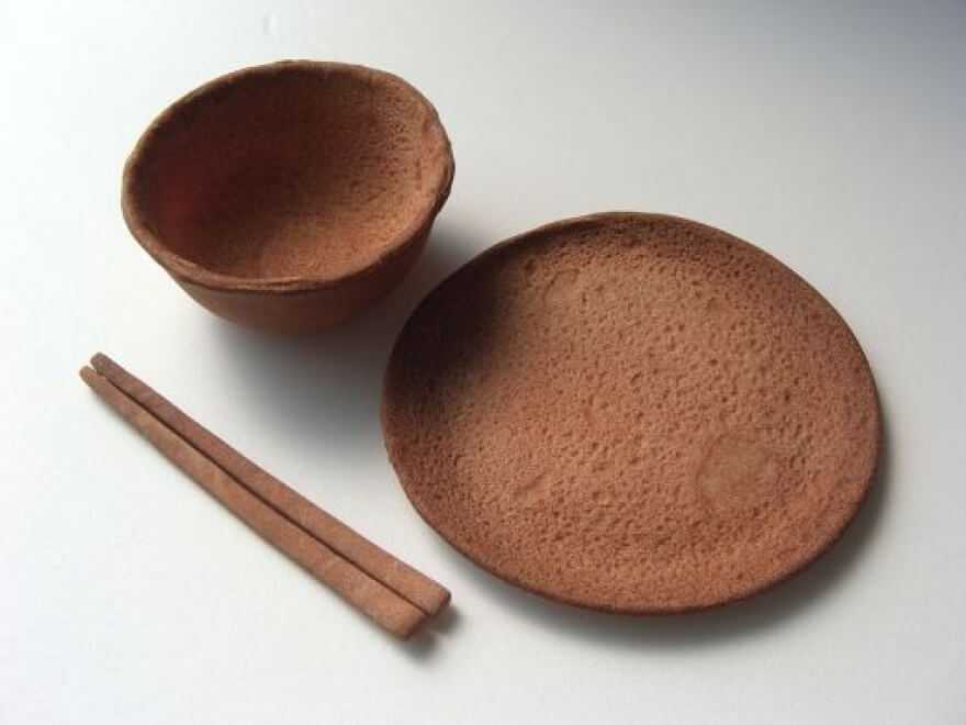 В некоторых кафе Японии уже не первый год делают тарелки из галет, изготовленных из рисовой муки, которую кладут под пресс. Материал получается очень прочным и устойчивым. Людям он вряд ли придется по вкусу, зато такую посуду с удовольствием едят птицы и животные.