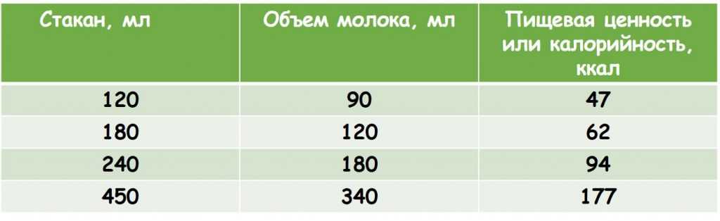 Для расчета нужно взять количество калорий молока, разделить на 100 и затем умножить на реальный объем молока. Если в стакане с объемом 240 мл использовать 180 мл молока с 2,5% жирности, калорийность получаемого латте будет равна: 52/100*180=93,6 ккал.