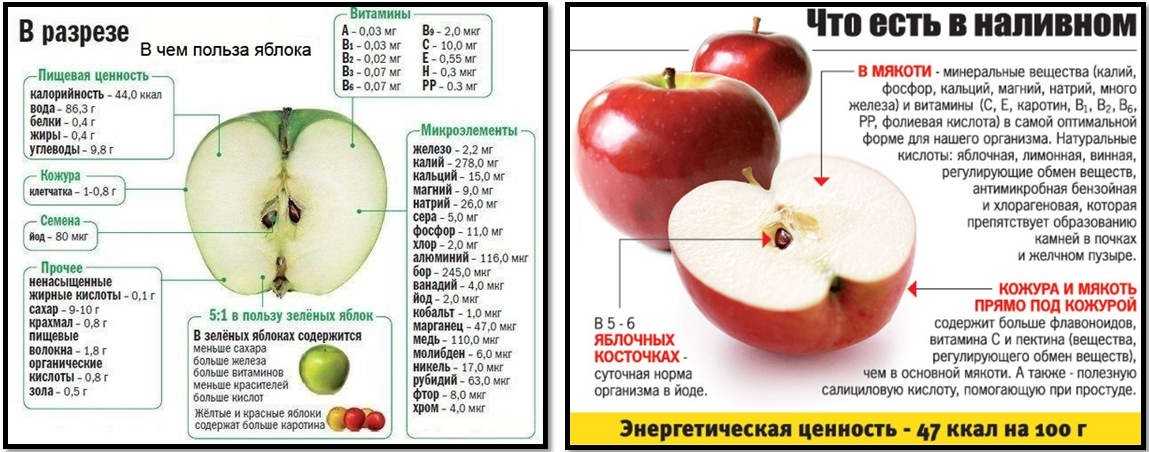- яблоки — их калорийность около 48 ккал в зависимости от сорта — содержат большое количество железа, витамина С, фосфора и пектина. Последние вещество помогает очистить организм от шлаков, а также кровь и сосуды. Ценные свойства яблок сохраняются и при запекании;